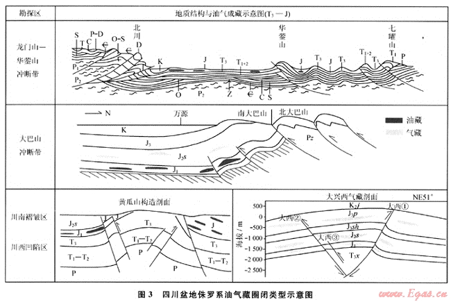 總之,除在龍門山沖斷帶、大巴山沖斷帶及華鎣山沖斷帶上升盤中生代和古生代地層遭到強烈剝蝕不具備封蓋和保存條件,逆沖大斷裂下降盤侏羅系地層上傾方向與具壓性特點的斷裂相接,可構成構造-巖性圈閉以外,盆內大部分地區(qū)都主要以巖性圈閉、構造(裂縫)-巖性圈閉為主(圖3)。油氣橫向運移受到制約,斷裂及其伴生裂縫成為油氣就近運移、就近捕獲的重要通道或載體,裂縫有利于油氣的富集。