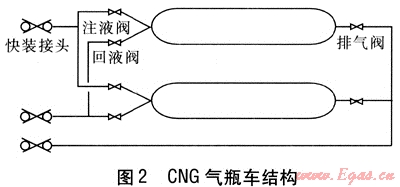 本文中的CNG氣瓶車是在普通CNG氣瓶車基礎(chǔ)上改裝而成的,其結(jié)構(gòu)見圖2。每輛CNG氣瓶車都有8個(gè)儲(chǔ)氣瓶,為了簡化圖形,圖中只畫出2個(gè)儲(chǔ)氣瓶。儲(chǔ)氣瓶兩端的注液閥、回液閥和排氣閥都是常閉型氣動(dòng)球閥,向氣動(dòng)球閥的氣缸充壓縮空氣則氣動(dòng)球閥開啟;氣缸泄氣則氣動(dòng)球閥關(guān)閉。