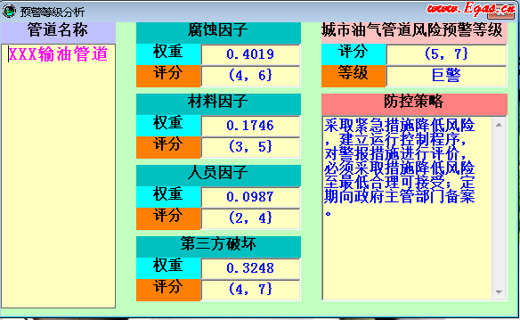 根據(jù)評價因子中所羅列的因素,在對應(yīng)評價標準下拉菜單中選擇符合實際現(xiàn)場管道情況后,軟件自行判斷其對應(yīng)的警度、風險分值、風險預(yù)警及控制策略,各評價因子的風險評定結(jié)果如圖 8—11所示。 風險評定之后,依據(jù)改進的肯特(W.Kent)管道風險評價方法(piperiskmanagementmanual),參考著名油氣儲運專家潘家華教授提出的風險模型,結(jié)合城市油氣管道風險現(xiàn)狀,給出各風險評定因子的權(quán)重分配,計算每個評定因子的評分錄入預(yù)警等級分析界面(如圖 12所示),再計算出最終該管道的評分區(qū)間為(5,7),對照城市油氣管道相對風險指數(shù)警度分級表得出預(yù)警等級為高風險巨警,并給出相應(yīng)的防控策略。