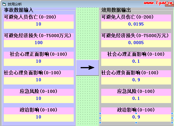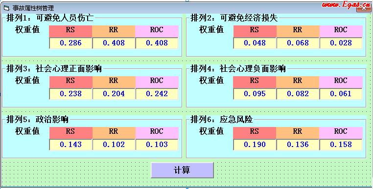 主要包括事故屬性值設(shè)定與屬性重要度排名區(qū)和應(yīng)急方案總效用值計算區(qū)兩大部分,界面如圖 7所示。