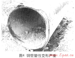 另外,施工單位應(yīng)有回拖時卡管情況下的應(yīng)急預(yù)案,龍大高速穿越卡管發(fā)生在第三塊孤石處,此時只需稍微后拉一下的擾動,再重新回拖時就可能錯過卡點(diǎn)。由于管道浮在泥漿中,這是不難做到的,而一味強(qiáng)拖則會越卡越緊。由于施工單位沒有合適的應(yīng)急預(yù)案,結(jié)果發(fā)生卡管時應(yīng)對失當(dāng),先是長時間停泵使泥漿干涸凝固,而后又在沒有鉆機(jī)有效引導(dǎo)情況下,用夯管錘暴力全程強(qiáng)夯,結(jié)果管段偏離管孔前行,導(dǎo)致鋼管塑性變形嚴(yán)重超標(biāo)(圖4)。