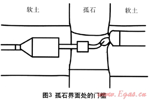 有人認(rèn)為增加洗孔次數(shù)可避免卡管,實際上在堅硬孤石與松軟土壤交錯分布的情況下,由于松軟土壤被反復(fù)沖刷,使得孔徑遠(yuǎn)大于堅硬孤石上的孔徑,從而在兩者交界處形成門檻。洗孔次數(shù)越多,門檻越明顯,管道回拖時發(fā)生卡管的風(fēng)險越大(圖3)。