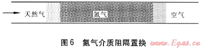 阻隔置換方法是近幾年在我國逐步推廣使用的,簡便易行、安全可靠。本文主要說明使用惰性氣體做中間介質的置換方法,氮氣介質阻隔置換見圖6。
