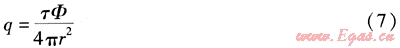 熱輻射通量是距射流軸線距離r處(火災危險區(qū)域半徑)的熱輻射強度,它表示距點源一定距離的熱接收量,它與點源輻射量和位置有關。