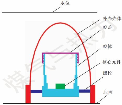 如圖2所示,防水透氣殼的外殼殼體采用橢球狀設(shè)計(jì),腔體高度大于外殼殼體高度的1/2。當(dāng)水位沒過裝置底面達(dá)10 m時(shí),防水透氣殼內(nèi)部氣體體積大約被壓縮到原體積的1/2,裝置的外殼殼體采用半橢球形設(shè)計(jì),因此,此時(shí)外殼殼體內(nèi)水面在外殼殼體高度的1/2位置以下。本裝置腔體的設(shè)計(jì)高度大于外殼殼體高度的1/2,因此,防水透氣殼內(nèi)的水面位置在腔蓋以下,可以防止液態(tài)水進(jìn)入腔體內(nèi)??梢?,即使在水位沒過裝置底面達(dá)10 m的惡劣條件下,該裝置仍能夠?qū)η惑w內(nèi)的核心元件起到很好的保護(hù)作用。