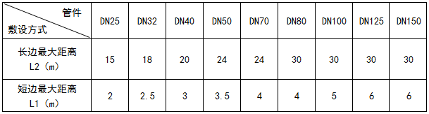 對于本文所述系統(tǒng)由固定點起,允許不裝補償器的直管段最大長度民用建筑為33m,工業(yè)建筑為42m。(管道伸長量分別為40mm和50mm)。實際設計時一般每段臂長不大于20~30m,不小于2m。在自然補償兩臂頂端設置固定支架。“г”型補償器一般用于DN150以下管道;最大允許距離與管徑關系見表1。“Z” 型補償器可以看做兩個“г”型補償器。