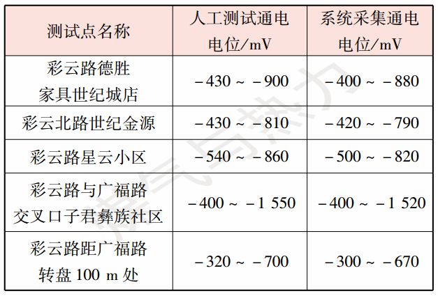 在近地鐵處選取5個(gè)測(cè)點(diǎn),人工測(cè)試選用便攜式參比電極測(cè)量通電電位。人工測(cè)試數(shù)據(jù)與系統(tǒng)測(cè)試數(shù)據(jù)的對(duì)比見表1。