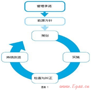 用能企業(yè)是實(shí)現(xiàn)能源節(jié)約的核心。在以節(jié)能減排為重要目標(biāo)的指引下,企業(yè)使用任何能源,都應(yīng)制定一個(gè)基本的控制程序,形成一個(gè)有效能源管理體系運(yùn)行模式。企業(yè)為兌現(xiàn)管理承諾和實(shí)現(xiàn)能源方針應(yīng)進(jìn)行策劃-實(shí)施-檢查與糾正-持續(xù)改進(jìn)(PDCA)等過程。圖示如下(圖表1):