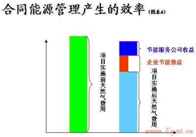 用能企業(yè)委托EMCo進(jìn)行能源系統(tǒng)的運(yùn)行管理和節(jié)能改造, EMCo通過提高能源效率降低能源費(fèi)用,并按照合同約定擁有全部或者部分節(jié)省的能源費(fèi)用。 EMCo的經(jīng)濟(jì)效益來自能源費(fèi)用的節(jié)約,用能企業(yè)的經(jīng)濟(jì)效益來自能源費(fèi)用(承包額)的減少。比如,一個(gè)工業(yè)企業(yè)年用天然氣量為1億方,通過合同能源管理的模式,年耗用9000萬方便能實(shí)現(xiàn)同樣的生產(chǎn)量(生產(chǎn)總值),總共節(jié)約1000萬方。按3元/立方米記,年節(jié)約能耗成本3000萬元。若用能企業(yè)與節(jié)能服務(wù)公司雙方簽訂的分享比例為6:4,分別給雙方帶來的經(jīng)濟(jì)效益為1800萬元、1200萬元。另外,還減少了節(jié)約1000萬方天然氣燃燒所產(chǎn)生的CO2,實(shí)現(xiàn)了社會(huì)效益,從而促進(jìn)了天然氣產(chǎn)業(yè)更好地發(fā)展。