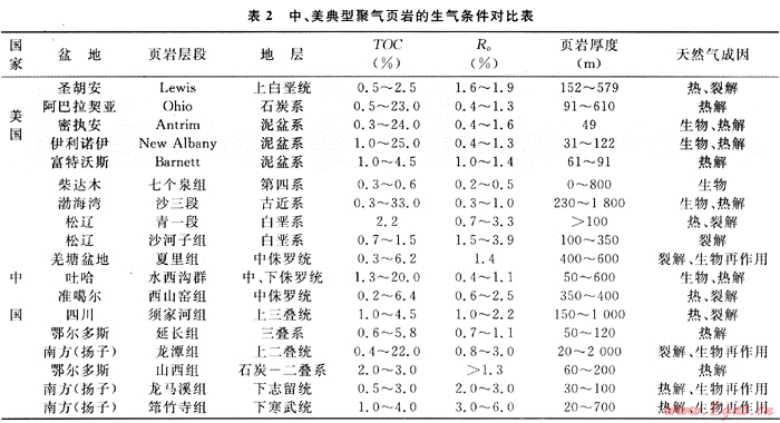 中國(guó)與美國(guó)在頁(yè)巖氣富集條件上具有許多相似之處,美國(guó)頁(yè)巖氣大規(guī)模的成功開(kāi)發(fā)為中國(guó)的頁(yè)巖氣勘探研究提供了參考模式。在美國(guó),圍繞加拿大地盾南緣形成了廣泛的古生界海相沉積,后期的改造和演化形成了現(xiàn)今呈弧形展布的一系列盆地;在中國(guó),塔里木、華北和揚(yáng)子地臺(tái)及其周緣廣泛發(fā)育了不同地質(zhì)時(shí)代的多套黑色頁(yè)巖,其頁(yè)巖氣形成條件完全可與北美相媲美(表2)。以美國(guó)東部與中國(guó)南方為例,兩者分別在頁(yè)巖發(fā)育時(shí)代、地層沉積格局、有機(jī)質(zhì)熱演化程度、后期構(gòu)造演化、破壞程度與保存條件、頁(yè)巖含氣性以及頁(yè)巖氣聚集模式等方面具有可比之處。從兩者系統(tǒng)對(duì)比的結(jié)果可以看出,中國(guó)頁(yè)巖氣形成的地質(zhì)條件優(yōu)越。