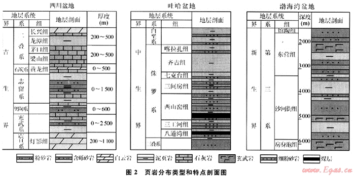 古生代結(jié)束以來(lái),全球性的區(qū)域板塊運(yùn)動(dòng)導(dǎo)致亞洲大陸發(fā)生碰撞作用并經(jīng)受了強(qiáng)烈的擠壓作用[9~10],在各板塊拼合并導(dǎo)致海水區(qū)域性退出的同時(shí),使得古生界海相頁(yè)巖地層經(jīng)受了強(qiáng)烈改造、擠壓變形或隆升剝蝕,在揚(yáng)子地區(qū)普遍形成了大面積暴露及近地表埋藏的古生界頁(yè)巖。而在構(gòu)造相對(duì)穩(wěn)定的華北、塔里木等地臺(tái)區(qū),構(gòu)造保存條件相對(duì)較好,目前仍有埋深不等的多套較大厚度的海相頁(yè)巖地層分布。不同有機(jī)質(zhì)條件、埋藏深度和產(chǎn)烴能力的黑色頁(yè)巖分別可能成為其他層位油氣富集的烴源巖、可能具有原地“成藏”特點(diǎn)[11~12]頁(yè)巖氣的物質(zhì)基礎(chǔ)或者兩種可能;進(jìn)入中生代,陸相沉積逐漸成為主體,主要在中國(guó)北方地區(qū)形成了區(qū)域分布的三疊系(如鄂爾多斯盆地等,也包括川西[13~15])、侏羅系(如準(zhǔn)噶爾[16]、吐哈等盆地)及白堊系(如松遼[17]、海拉爾等盆地)湖相暗色泥頁(yè)巖。雖然新生代的差異性構(gòu)造運(yùn)動(dòng)導(dǎo)致了部分地層的裸露剝蝕,但目前仍有大規(guī)模的殘留保存和區(qū)域分布,結(jié)果導(dǎo)致產(chǎn)生了不同地質(zhì)時(shí)代、埋藏深度和熱演化程度泥頁(yè)巖的同時(shí)發(fā)育。對(duì)于抬升幅度較大、保存條件較差的富含有機(jī)質(zhì)泥頁(yè)巖,雖然它們已不再適合作為常規(guī)天然氣圈閉的源巖基礎(chǔ),但仍有可能是頁(yè)巖氣資源富集的潛在目標(biāo);與古生界和中生界泥頁(yè)巖的多期作用特點(diǎn)不同,新生界泥頁(yè)巖主要發(fā)育在保存條件較好的盆地區(qū)域內(nèi)[18]。由于其他層系天然氣的聚集需要首先滿足其自身對(duì)天然氣聚集的需要,故常規(guī)油氣地質(zhì)分析中的氣源巖(泥頁(yè)巖)將有可能同時(shí)成為頁(yè)巖氣勘探的新對(duì)象。