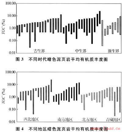 古生界、中生界分布范圍較廣并大致以天山為中心形成南、北“蹺蹺板”式沉積特點(diǎn),即早古生代時(shí)以天山以南的塔里木地塊為沉降沉積中心,形成較大面積分布的海相頁(yè)巖。晚古生代時(shí)則以天山以北的準(zhǔn)噶爾地塊為中心形成頁(yè)巖沉積。晚二疊紀(jì)末中生代以來(lái),全區(qū)進(jìn)入陸相沉積環(huán)境,“蹺蹺板”運(yùn)動(dòng)基本結(jié)束,總體上表現(xiàn)出總有機(jī)碳含量向上逐漸增加的趨勢(shì)。