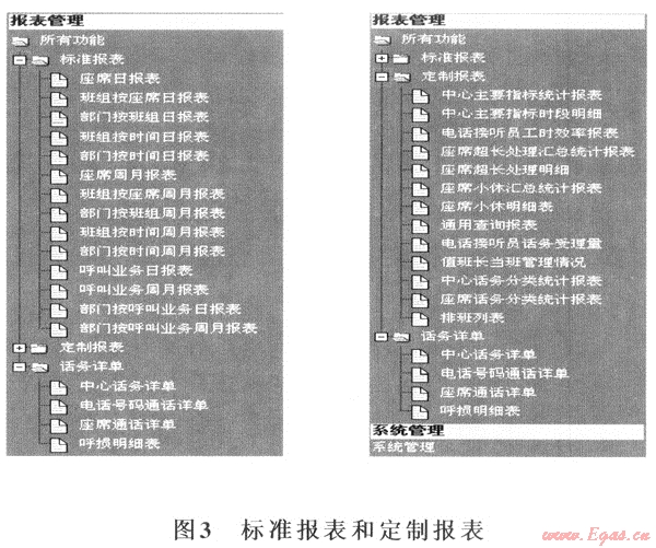 與服務熱線數(shù)字化管理的基本應用工具比較,報表反映的內容更全面更系統(tǒng)。尤其體現(xiàn)在熱線定制報表上。它把企業(yè)多年來在傳統(tǒng)數(shù)據統(tǒng)計匯總報表上積累的經驗作了優(yōu)化組合和集中提煉,針對性和效果都很好。圖3截取了報表管理系統(tǒng)中有關報表分類的樹狀結構分布。