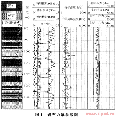 地層的孔隙壓力、體積模量、楊式模量、單軸抗壓強(qiáng)度、最小水平主應(yīng)力方向等參數(shù)是出砂預(yù)測(cè)的重要參數(shù)。這些參數(shù)均可在實(shí)驗(yàn)室和氣井生產(chǎn)過(guò)程得到,但得出的數(shù)據(jù)是離散的且成本較高。目前已經(jīng)有成熟的利用測(cè)井方法求散巖石力學(xué)參數(shù)的方法[1],筆者采用Schlumberger公司的STARS軟件,以縱波時(shí)差、橫波時(shí)差、補(bǔ)償密度、泥質(zhì)含量和地層孔隙度為輸入曲線,求取巖石的彈性模量和巖石強(qiáng)度。圖1為計(jì)算得到的地層的巖石力學(xué)參數(shù),這些參數(shù)將用于出砂預(yù)測(cè)。