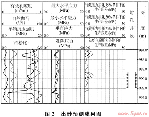 圖2中,988.7~992.0m井段為射孔層位。處理結(jié)果表明,在初始?xì)獠貕毫l件下,地層臨界出砂的生產(chǎn)壓差為1~10MPa;如果氣藏壓力下降25%(見(jiàn)氣藏壓力損耗25%條件下的生產(chǎn)曲線),那么,該射孔層位下部會(huì)出砂。