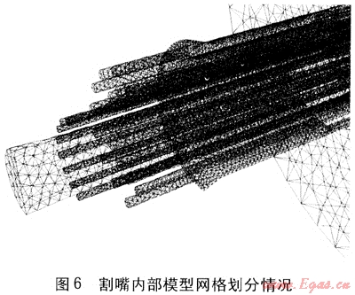 本文應(yīng)用CFD軟件對割嘴內(nèi)外圈氧氣與丙烷的流動(dòng)和燃燒做了冷態(tài)、熱態(tài)模擬。模擬計(jì)算的模型包括割嘴內(nèi)部氣體流場和割嘴外部空間氣體流場兩部分,因?yàn)楦钭焓侵行膶ΨQ的,所以只模擬整個(gè)割嘴的一半??傮w幾何模型見圖3,其中割嘴外部空間是直徑為200mm,長度為1600mm的半圓柱體。割嘴內(nèi)部模型見圖4,包括高壓切割氧孔道、內(nèi)外圈預(yù)熱氧孔道、燃?xì)饪椎?。三維網(wǎng)格劃分情況見圖5、6,其中圖6是圖5的局部放大圖。