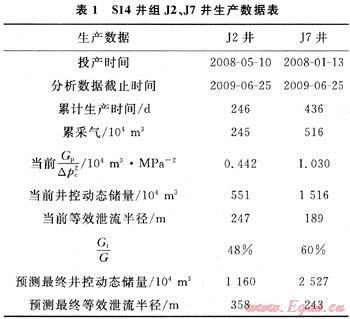 J2和J7是S14井組不同時間投產(chǎn)的生產(chǎn)井,基本數(shù)據(jù)如表1所示。首先根據(jù)氣井的生產(chǎn)時間及當前單位套壓降產(chǎn)氣量查對Gp/△pc2-t圖版(圖2),可初步判斷蘇J2為Ⅲ類井,J7為Ⅱ類井;然后采用FAST.RTA軟件對氣井進行動態(tài)分析,可得到氣井的當前井控動態(tài)儲量Gt和等效泄流半徑(Rt);再根據(jù)井型和生產(chǎn)時間查對Gt/G-t圖版(圖3-b),得到2口井的Gt/G值分別為48%和60%,由此可求出最終井控動態(tài)儲量(G)和最終等效泄流半徑(R)。