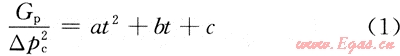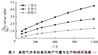 S6區(qū)塊是蘇里格氣田最早投產(chǎn)的區(qū)塊,其地質(zhì)條件與蘇里格氣田其他區(qū)塊相似,氣井的生產(chǎn)動態(tài)也基本相似。S6區(qū)塊第一批生產(chǎn)井于2002年投產(chǎn),生產(chǎn)期已超過7a,氣井的滲流邊界已達到或接近真實的氣藏邊界,處于低壓低產(chǎn)中后期。在實際生產(chǎn)中,絕大部分氣井只進行了井口油套壓和產(chǎn)量的監(jiān)測,對氣井的生產(chǎn)數(shù)據(jù)進行分析,發(fā)現(xiàn)氣井的單位套壓降采氣量(Gp/△pc2)隨生產(chǎn)時間動態(tài)變化,兩者之間呈良好的二次多項式關(guān)系,相關(guān)系數(shù)大于0.96。即