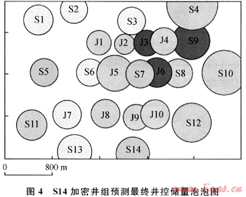 圖4是根據(jù)圖版預(yù)測得到的S14加密井組最終井控動態(tài)儲量泡泡圖,可以看出它與生產(chǎn)早期的動態(tài)分析結(jié)果(圖2)相比有很大差異。生產(chǎn)至廢棄時,S14加密井組的平均最終井控動態(tài)儲量為2920×104m3(最終可采出氣量為2480×104~2630×104m3),平均最終泄流面積為0.206km2,由于儲層具有較強的非均質(zhì)性。因此各單井的最終井控儲量和泄流面積之間存在較大的差異。