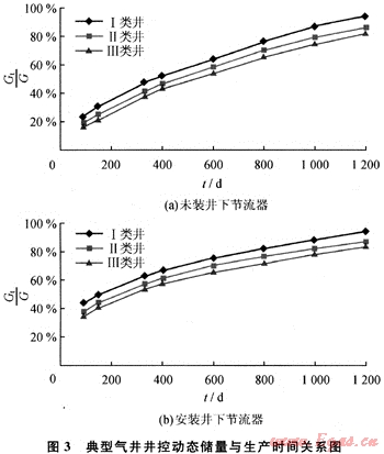 氣井在各生產(chǎn)階段的單位套壓降產(chǎn)氣量的變化規(guī)律直接反映了氣井井控動態(tài)儲量隨生產(chǎn)時間變化的規(guī)律。采用FAST.RTA軟件對這些氣井進行動態(tài)分析,求得不同生產(chǎn)時間的井控動態(tài)儲量(Gt),發(fā)現(xiàn)Gt-t與Gt/△pc2-t有相同的變化規(guī)律,Gt在早期隨生產(chǎn)時間t增加而快速增大,后期逐漸趨緩變平,兩者之間呈良好的二次多項式關(guān)系;當Gt不再隨生產(chǎn)時間增大時,可認為已達到了最大井控動態(tài)儲量,記為Gt歸納這些氣井的Gt/G-t關(guān)系,可得到3類典型氣井井控動態(tài)儲量隨生產(chǎn)時間變化的關(guān)系圖版。在研究過程中發(fā)現(xiàn)氣井的生產(chǎn)制度對井控動態(tài)儲量的變化規(guī)律有較大影響,氣井初始配產(chǎn)越高,其初始階段的井控動態(tài)儲量和泄流面積越小。蘇里格早期投產(chǎn)井大部分未安裝井下節(jié)流器,初始配產(chǎn)較高,而近年來投產(chǎn)的氣井普遍采用了井下節(jié)流技術(shù),初始配產(chǎn)較低(圖3)。