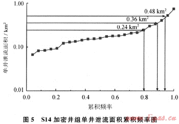 圖5是S14加密井組的單井泄流面積累積頻率圖,可知80%以上氣井的泄流面積小于0.24km2,95%以上氣井的泄流面積小于0.48km2,可推算出當井排距為400m×600m時,發(fā)生井間干擾的概率為7%~22%,而當井排距為600m×800m時,發(fā)生井間干擾的概率小于5%。