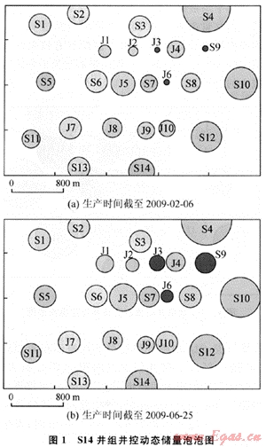 蘇里格氣田是典型的低滲透致密砂巖氣藏,筆者采用FAST.RTA軟件對蘇里格氣田的多口氣井進行跟蹤分析,發(fā)現(xiàn)氣井的井控動態(tài)儲量和泄流面積是隨生產(chǎn)時間動態(tài)變化的。其中S14區(qū)塊加密井組的分析結(jié)果為:從投產(chǎn)日到2009年2月6日,平均井控動態(tài)儲量為1698×104m3,平均單井等效泄流半徑為176m;從投產(chǎn)日到2009年6月5日,平均井控動態(tài)儲量為1867×104m3,平均單井等效泄流半徑為191m。圖1列出了S14區(qū)塊加密井組不同生產(chǎn)時間段氣井的井控動態(tài)儲量圖,氣泡的大小代表井控動態(tài)儲量的相對大小,不同顏色表示氣井的投產(chǎn)時間不同。