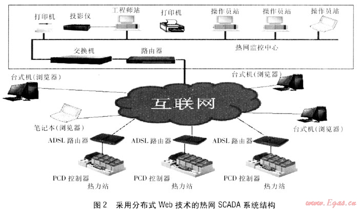 實(shí)現(xiàn)分布式Web技術(shù)熱網(wǎng)SCADA系統(tǒng)的前提條件就是必須采用嵌入Web服務(wù)器功能的PCD控制器。PCD控制器將采集到的熱網(wǎng)信息及時(shí)發(fā)布到Internet上去,熱力站的運(yùn)行管理人員可以隨時(shí)隨地用Web瀏覽器進(jìn)行遠(yuǎn)程訪問,獲取最新的熱力站現(xiàn)場運(yùn)行信息,實(shí)現(xiàn)對熱網(wǎng)實(shí)時(shí)有效的遠(yuǎn)程監(jiān)控和集中管理。因此,采用分布式Web技術(shù)的熱網(wǎng)SCADA系統(tǒng)是今后的發(fā)展方向。