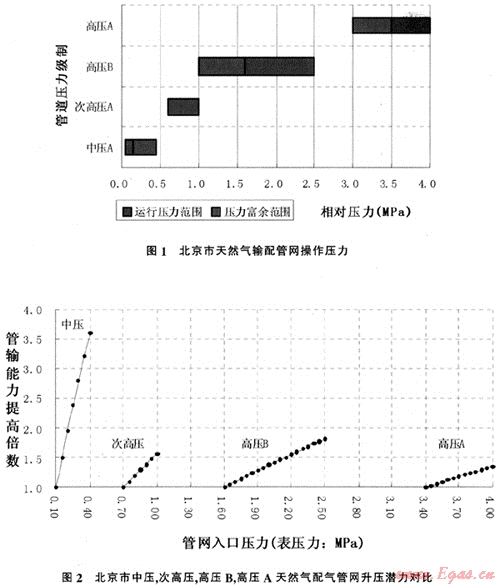 2008年—2009年冬季高峰日輸送氣量為4230萬m3,小時高峰輸送量為210萬m3。自1997年以來,年高峰日輸送量平均增長率超過40%。若實現(xiàn)北京市120億m3天然氣供應(yīng)量目標(biāo),據(jù)測算,高峰輸送量為10500萬m3,高峰小時輸送量為580萬m3。在現(xiàn)有管網(wǎng)最大運行壓力下,提高輸送能力的方法。一是增加進(jìn)氣點既建調(diào)壓站,二是增加管線建設(shè)。北京天然氣高壓以上管線僅占總管線長度的8.6%,合理增建高壓管線是有必要的,也是有條件的。但中壓管線已占總管線長度的40%,中壓天然氣管線幾乎遍布市區(qū)所有主干公路,據(jù)北京天然氣管網(wǎng)規(guī)劃。2020年中壓管網(wǎng)輸送能力將由目前150萬m3增加到255萬m3。單靠增加中壓管線建設(shè)提高管網(wǎng)輸送能力即不經(jīng)濟也不現(xiàn)實。因此,如何提高現(xiàn)有管網(wǎng)的輸送能力,是我們亟待解決的問題。