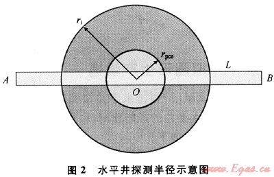基于以上認(rèn)識(shí)和假設(shè),將水平井的探測(cè)半徑定義為:以水平段AB的中點(diǎn)為圓心0,以擬圓形生產(chǎn)坑道外緣半徑為基準(zhǔn),在生產(chǎn)過(guò)程壓力脈沖響應(yīng)達(dá)到的最大位置至圓心O的距離(圖2)。