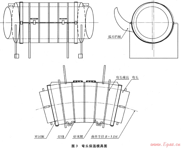 彎頭防腐保溫結構:熱收縮帶防腐+彎頭保溫模塊層+熱收縮帶防護。彎頭保溫結構見圖2所示。
