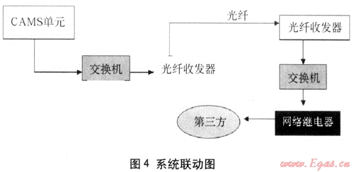 利用鋪設(shè)的備用光纖組建局域網(wǎng),通過交換機(jī)把5臺控制器接入,同時(shí)也將設(shè)置在“主調(diào)中心”內(nèi)部監(jiān)控中心的“CAMS單元”通過交換機(jī)接入整體系統(tǒng)來實(shí)現(xiàn)對前端5臺控制器的集中管理,利用CAMS單元的電子地圖功能來對防護(hù)目標(biāo)進(jìn)行實(shí)時(shí)監(jiān)控。“光纖收發(fā)器”和“網(wǎng)絡(luò)繼電器”以及“CAMS單元”來實(shí)現(xiàn)前端管道現(xiàn)場其它設(shè)備的聯(lián)動(圖4)。