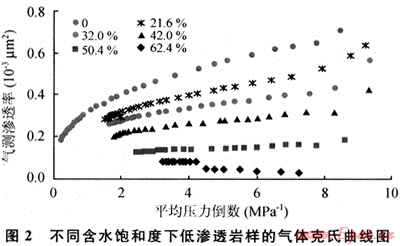 實驗表明,較之于中高滲透巖心而言,低滲透巖樣氣相、水相最大相對滲透率值較小。氣、水共滲區(qū)域較窄,隨含水飽和度升高,水相相對滲透率上升緩慢,水相形成連續(xù)流動,而氣相無因次滲透率迅速下降接近于0,出現(xiàn)所謂的“水鎖”現(xiàn)象[3](圖1)。Muskat等人[5]建立的兩相滲流運動方程成立的前提是相對滲透率僅是含水飽和度的函數(shù),而不受壓力、流速以及界面阻力的影響。即