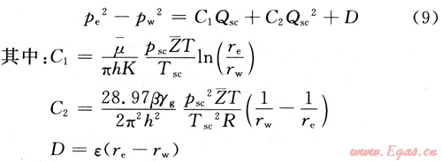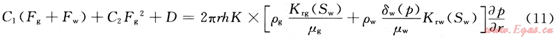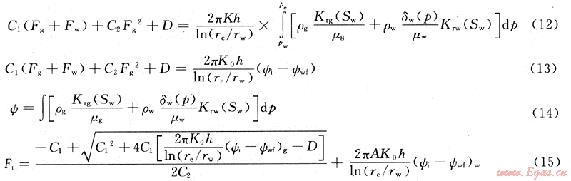 假設(shè)一口氣水兩相流氣井位于均質(zhì)、水平等厚的無限大地層中,儲層中發(fā)生氣、水兩相等溫滲流,符合非線性滲流方程式(5)、式(6),氣、水彼此互不相溶,忽略重力及毛細管力的影響。當?shù)蜐B透多孔介質(zhì)中的流體遵循非線性滲流方程式(5)、(6)時,氣體在低滲透多孔介質(zhì)中遵循二項式運動規(guī)律,即式(1),相應(yīng)的產(chǎn)能方程可寫為[7]: