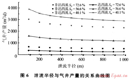 當井底流動壓力為10MPa、即生產(chǎn)壓差為10MPa時,在同樣的泄流半徑條件下,隨著低滲透儲層含水飽和度的增大,氣井產(chǎn)能逐漸減??;在同樣含水飽和度條件下,隨泄流半徑的增加,氣井產(chǎn)量下降,氣井產(chǎn)量在泄流半徑小于200m的范圍內(nèi)下降幅度較大,大于200m以后,下降幅度減緩,當泄流半徑超過300m后,氣井產(chǎn)量基本不再受泄流半徑的影響。在理論上低滲透氣井的合理井距應(yīng)布置在600m以內(nèi)為宜(圖6)。