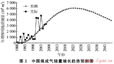 煤成氣儲(chǔ)量增長(zhǎng)預(yù)測(cè)參數(shù)選?。篈=4500,C=12,x=3,T0=1988。