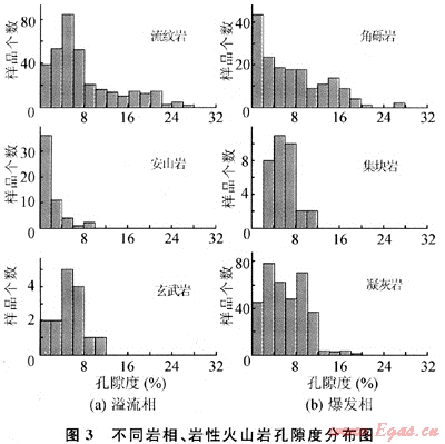 火山巖儲層形成受多因素的控制?;鹕綆r相控制了儲層原生孔隙和原生裂縫,是好儲層形成的基礎(chǔ),爆發(fā)相為火山巖相最有利的相帶。對979塊火山巖樣品的孔隙度進(jìn)行統(tǒng)計(jì)顯示:爆發(fā)相優(yōu)于溢流相;爆發(fā)相中角礫巖的物性最好,凝灰?guī)r次之(圖3)。