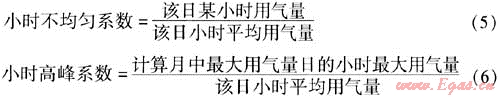小時不均勻系數(shù)表示1d中小時用氣量的不均勻性,該日最大小時不均勻系數(shù)稱為小時高峰系數(shù)。小時不均勻系數(shù)和小時高峰系數(shù)的計算公式為: