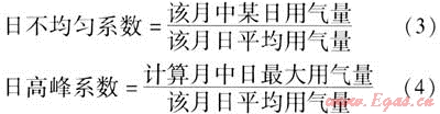 日不均勻系數(shù)表示1個月中日用氣量的變化情況,最大日不均勻系數(shù)稱為日高峰系數(shù)。日不均勻系數(shù)和日高峰系數(shù)的計算公式為: