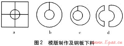 ③ 將剪好的工程紙?zhí)兹肴細(xì)夤艿?,覆蓋到套管上,用錘子垂直擊打工程紙,得到管道與套管之間圖形的壓環(huán)模版,見(jiàn)圖2c。