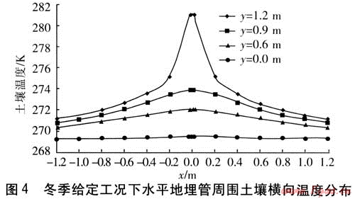 由圖3可知,土壤溫度沿縱軸方向成不對稱單峰狀分布,經(jīng)分析可得到如下結(jié)論:①從地埋管所在位置y=1.2m沿縱向向兩側(cè)遠(yuǎn)離地埋管,土壤溫度逐漸降低。在x=0.3、0.6、1.2m的3條縱軸上,溫度曲線存在以y=1.2m為中心向兩側(cè)下降趨勢,即土壤溫度在y=1.2m處溫度最高,向兩側(cè)降低。值得注意的是,在x=0這條縱軸上,溫度分布不連續(xù),在地埋管外壁最上端y=1.1855m與最下端y=1.2145m之間間斷,這是水平地埋管位置所在。②以y=1.2m為中心,每條溫度曲線的左半部都要比右半部陡,且不以y=1.2m為中心對稱。這是由于地埋管上方土壤(y<1.2m)比下方土壤(y>1.2m)受大氣溫度影響更大。③4條曲線的變化幅度不同,說明隨著位置橫向遠(yuǎn)離地埋管,土壤溫度的縱向變化逐漸趨緩。