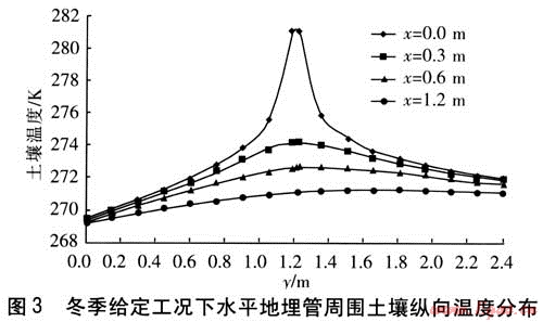 由圖4可知,土壤溫度沿橫軸方向成完全對稱的單峰狀分布,經(jīng)分析可得到如下結(jié)論:①從地埋管所在位置x=0沿橫向向兩側(cè)遠(yuǎn)離地埋管,土壤溫度逐漸降低。在y=0.6、0.9、1.2m的3條橫軸上,溫度曲線存在以戈=0為中心向兩側(cè)下降的趨勢,即土壤溫度在x=0處溫度最高,向兩側(cè)降低。同樣在y=1.2m這條橫軸上,溫度分布不連續(xù),在管外壁最左端x=-0.0145m與最右端x=0.0145m之間間斷,這是水平地埋管位置所在。②4條曲線的變化幅度不同,y=1.2m橫軸上的土壤溫度變化最大,y=0橫軸上的溫度變化最小。這說明隨著位置