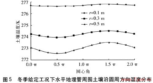 由圖5可知:①土壤溫度沿圓周方向呈正弦曲線分布,每個圓周上溫度最高點(diǎn)(曲線波峰)都是出現(xiàn)在原平面的1.5π方向,即圓周最底端;溫度最低點(diǎn)(曲線波谷)出現(xiàn)在原平面的0.5π方向,即圓周最頂端。②圓周方向上的土壤溫度呈正弦曲線分布,但每個圓周上的土壤平均溫度不同,即土壤溫度沿3條正弦曲線都在自己的中心線附近變化。這是由于隨著圓周遠(yuǎn)離地埋管,土壤溫度逐漸降低,r=0.1m圓周上的土壤平均溫度要高于r=0.3、0.5m圓周上的土壤平均溫度。③圓周方向上的土壤溫度呈正弦曲線分布,但每個圓周上的土壤溫度變化幅度各不相同,即溫度曲線的振幅不同。r=0.1m的曲線振幅最小,r=0.5m的曲線振幅最大,即距地埋管中心越近的圓周,其上土壤溫度變化程度越??;距地埋管中心越遠(yuǎn)的圓周,其上土壤溫度變化程度越大。這是由于地埋管上方的土壤隨著位置越遠(yuǎn)離地埋管越易受到大氣低溫的影響,因此地埋管上方的土壤隨著位置遠(yuǎn)離地埋管,溫度逐漸降低,而且這種降低的速度越來越快。而地埋管下方的土壤隨著位置越遠(yuǎn)離地埋管受大氣低溫的影響越小,這部分土壤由于遠(yuǎn)離地埋管溫度也逐漸降低。但由于深度加大受大氣低溫影響減小,這種降低的速度卻是越來越慢的。這就導(dǎo)致在距地埋管距離越遠(yuǎn)的圓周上,土壤溫度差距越大,即同一圓周上土壤的溫度變化越劇烈,變化的范圍越大。