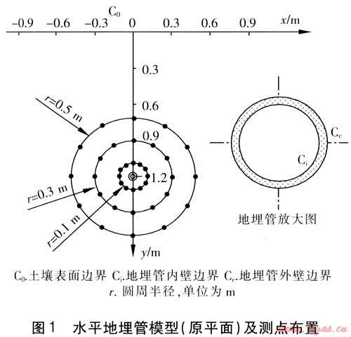 國內(nèi)外對土壤源熱泵的研究主要集中在以下幾個方面:地埋管換熱器傳熱模型,地埋管的敷設(shè)形式及管材,土壤特性對地埋管換熱器傳熱性能的影響,系統(tǒng)的設(shè)計(jì)和安裝,回填材料,土壤源熱泵系統(tǒng)的能耗分析及技術(shù)經(jīng)濟(jì)評價(jià),帶輔助裝置的混合式土壤源熱泵。這些研究主要涉及土壤與地埋管換熱器的熱交換特性,即地埋管壁及其周圍土壤的溫度場分布[1]。