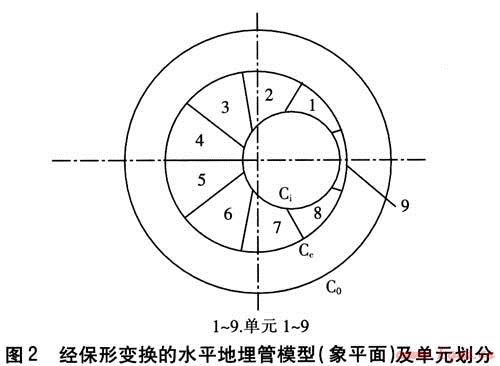 以水平地埋管換熱器土壤源熱泵為研究對象,建立水平地埋管的二維數(shù)學(xué)模型,該模型屬于圓柱理論模型。水平地埋管模型(原平面)及測點(diǎn)布置見圖1。采用邊界離散法對水平地埋管換熱器的熱力狀況進(jìn)行分析,通過保形變換(見圖2)、分離變量及區(qū)域銜接得到了溫度場的級數(shù)解。在確定級數(shù)各項(xiàng)系數(shù)時(shí),對于正交部分,采用傳統(tǒng)的Fourier方法;對于非正交部分,采取積分邊界元的方法[3~5]。模型軟件采用VB編制,計(jì)算水平地埋管及其周圍壤溫度場、熱流量分布、單位管長換熱量。