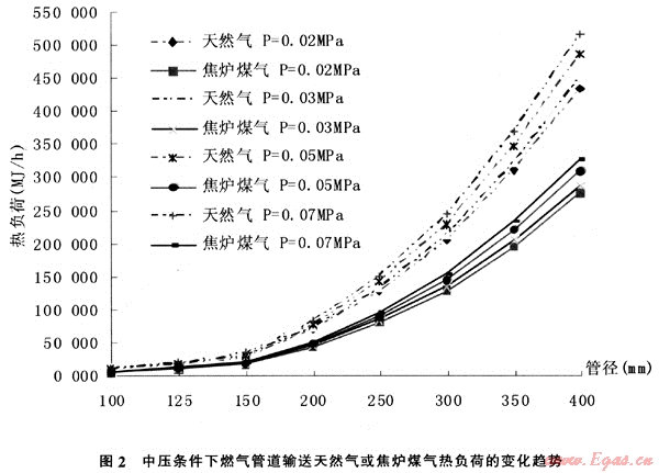 (2) 中壓狀態(tài)時。燃?xì)夤艿垒斔吞烊粴庀鄬範(fàn)t煤氣熱負(fù)荷的增長率為57%~58%,即原有燃?xì)夤艿烙山範(fàn)t煤氣置換為天然氣后管道輸送能力增長率為57%~58%。