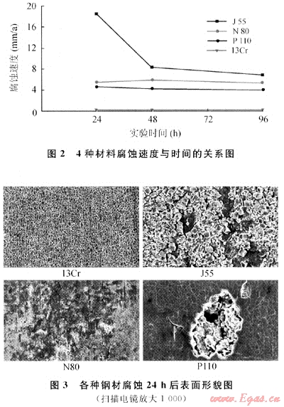 采用配制的實(shí)驗(yàn)溶液和制定的實(shí)驗(yàn)條件,對(duì)N80、J55、P110、13Cr 4種材質(zhì)進(jìn)行耐蝕性評(píng)價(jià),實(shí)驗(yàn)結(jié)果見圖2、3,可得出如下管材防腐性能結(jié)論: