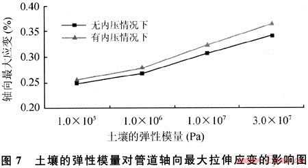 改變管溝內土壤的彈性模量,計算得到的管道軸向最大拉伸應變值,如圖7所示。計算結果表明:隨著管溝內土壤的彈性模量的減小,管道所受的軸向拉伸應變分別以11.05%、14.06%和7.82%的速率減小。據此可得到在軟土環(huán)境中管道可以抵抗更大的斷層位移,而在硬土環(huán)境中管道的拉伸應變比較大的結論。