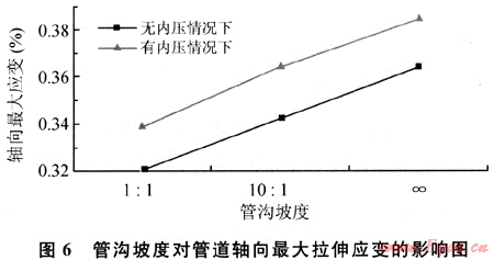 改變管溝坡度,計算得到的管道軸向最大拉伸應變值如圖6所示。計算結果表明:隨著管溝坡度的增大,管道所受的軸向拉伸應變分別以5.30%和7.01%的速率增大。