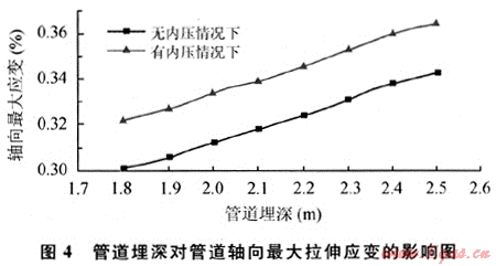 由于受凍土線的限制,管道埋深不宜淺于1.8m。改變管道埋深,計算得到的管道軸向最大拉伸應變值如圖4所示。計算結果表明:隨著管道埋深的增加,管道受到的最大拉伸應變有所增加。