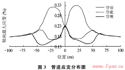 穿越該斷層的管道主要受軸向拉伸應力作用,因而可在只控制管道軸向最大拉伸應變情況下分析各參數(shù)對管道應變的影響。管道軸向坐標建立在管道穿越斷層處。在斷層作用下管道的應變分布見圖3,從圖上可以看到管道最大應變出現(xiàn)在斷層兩側30m范圍內。